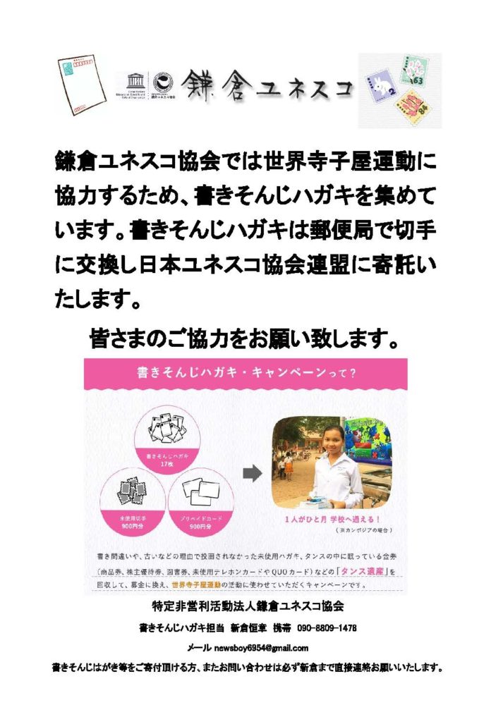 書きそんじハガキを集めています 投稿日 2025年9月18日 著者 staff カテゴリー お知らせ カテゴリー 識字・世界遺産保全支援委員会 鎌倉ユネスコ協会では世界寺子屋運動に協力するため、書きそんじハガキを集めています。書きそんじハガキは郵便局で切手に交換し日本ユネスコ協会連盟に寄託いたします。皆さまのご協力をお願い致します。 書きそんじはがき等をご寄付頂ける方、またお問い合わせは必ず新倉まで直接連絡お願いいたします。 特定非営利活動法人鎌倉ユネスコ協会書きそんじハガキ担当 新倉恒章 携帯 090-8809-1478メーール newsboy6954@gmail.com pickup